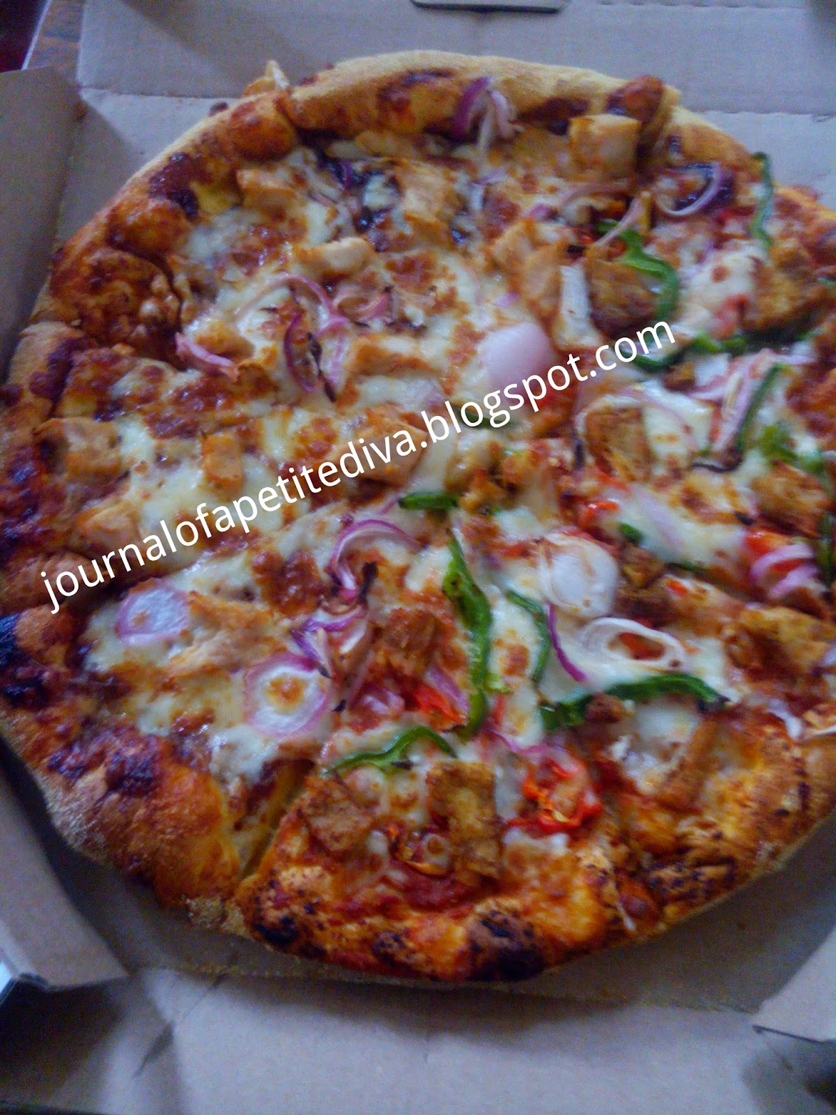 | Half and half pizza....Chicken suya and BBQ Chicken from Dominos pizza... |