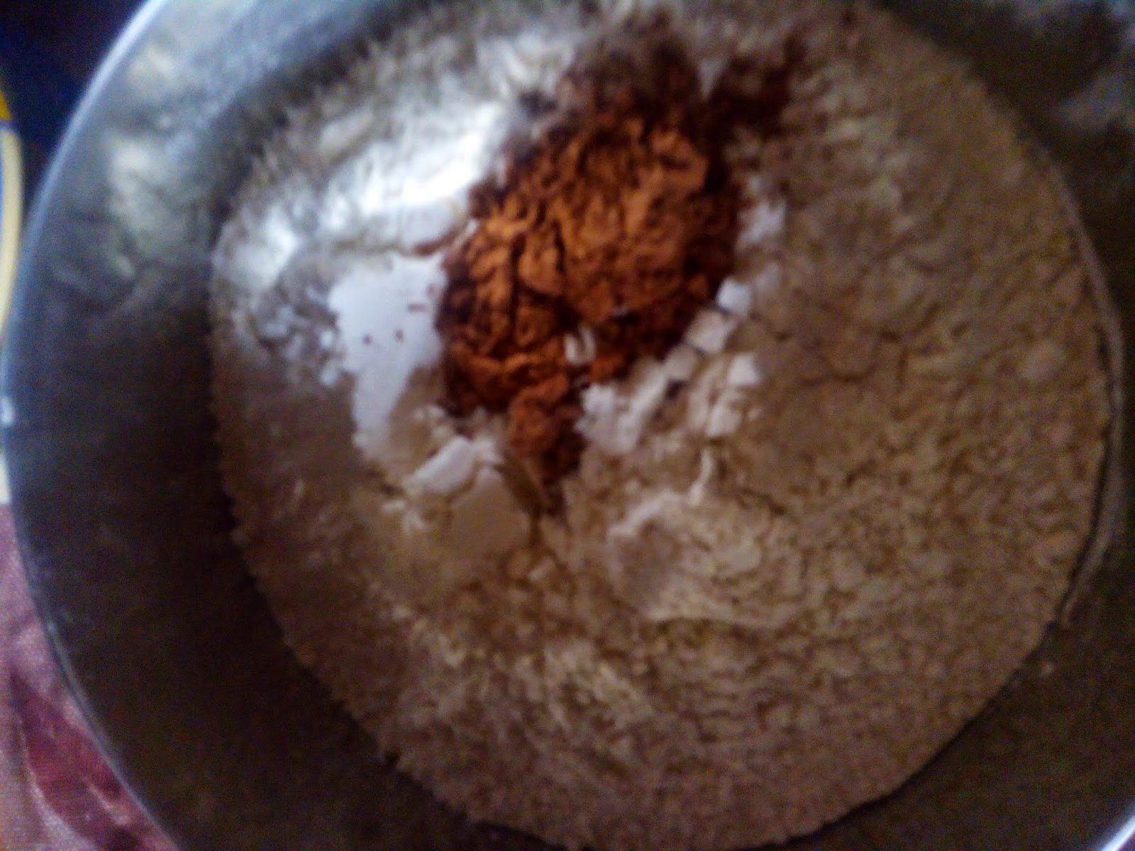 Add flour (sifted), baking powder, salt and cocoa little by little and mix.
