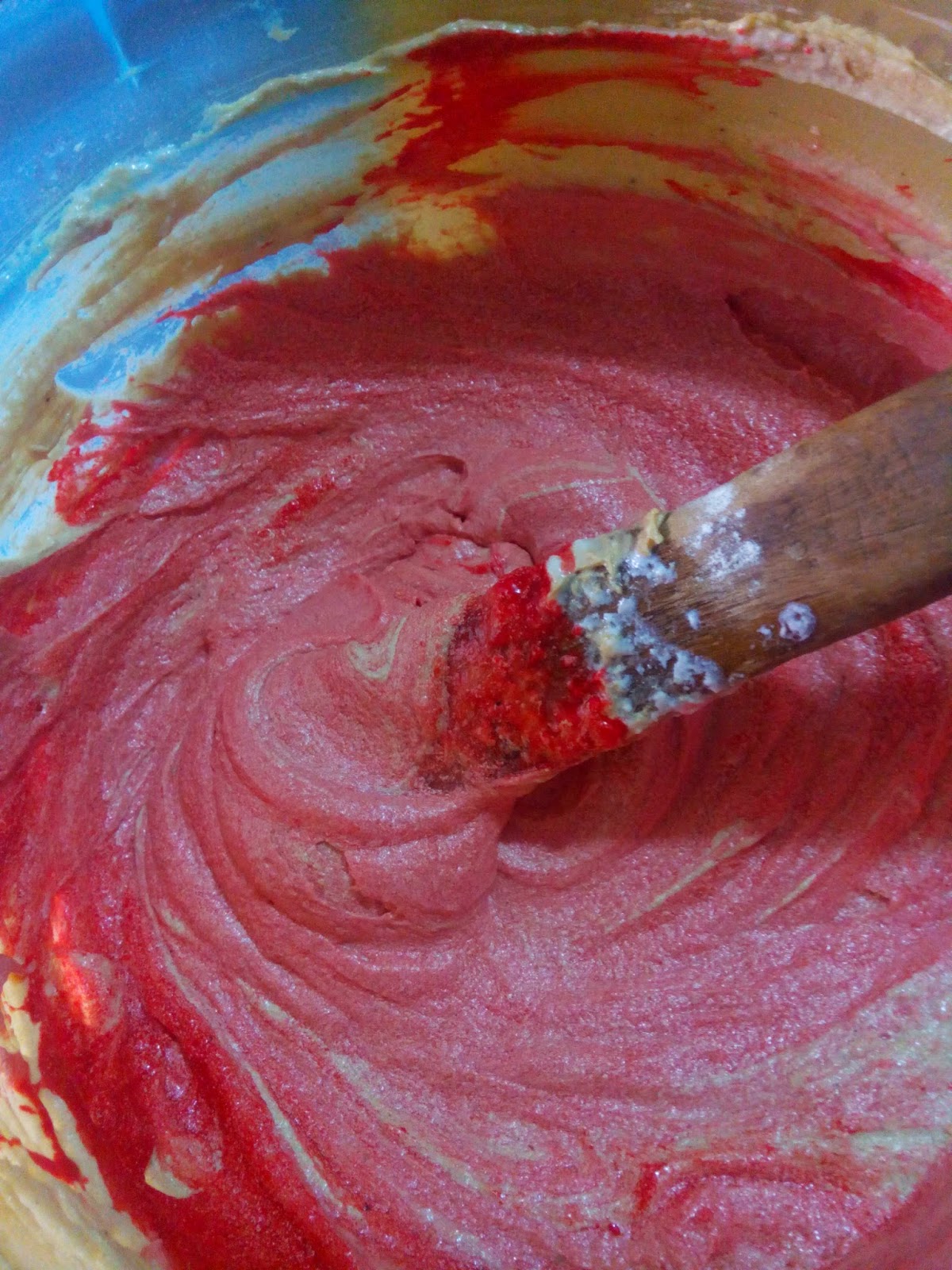 Then mix the red color paste with the other half of the buttermilk and add to the cake batter.