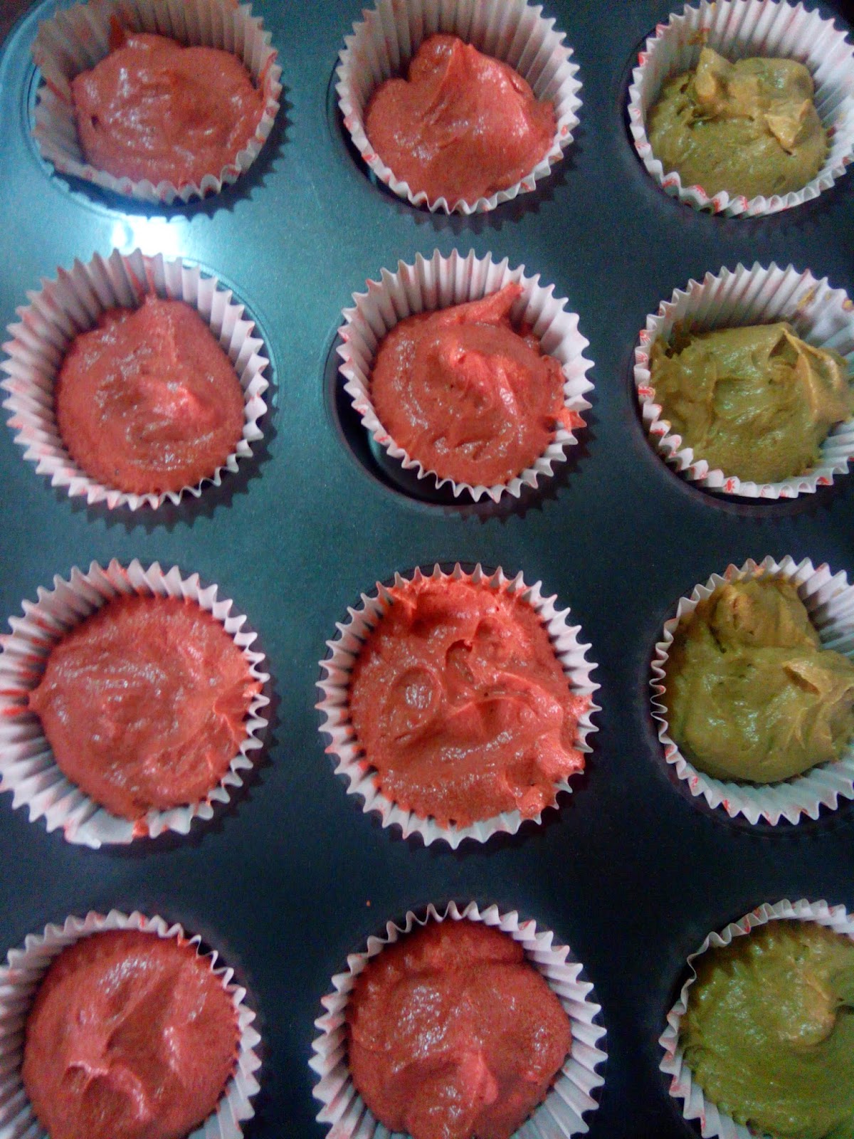 Line your muffin pan with cupcake cases, pour and bake in a preheated oven for 25 mins. I have no idea about the temperature i used but I used the lowest level of heat in our oven which was one.